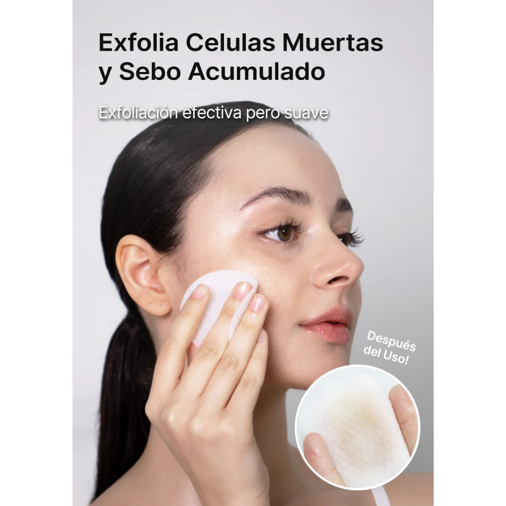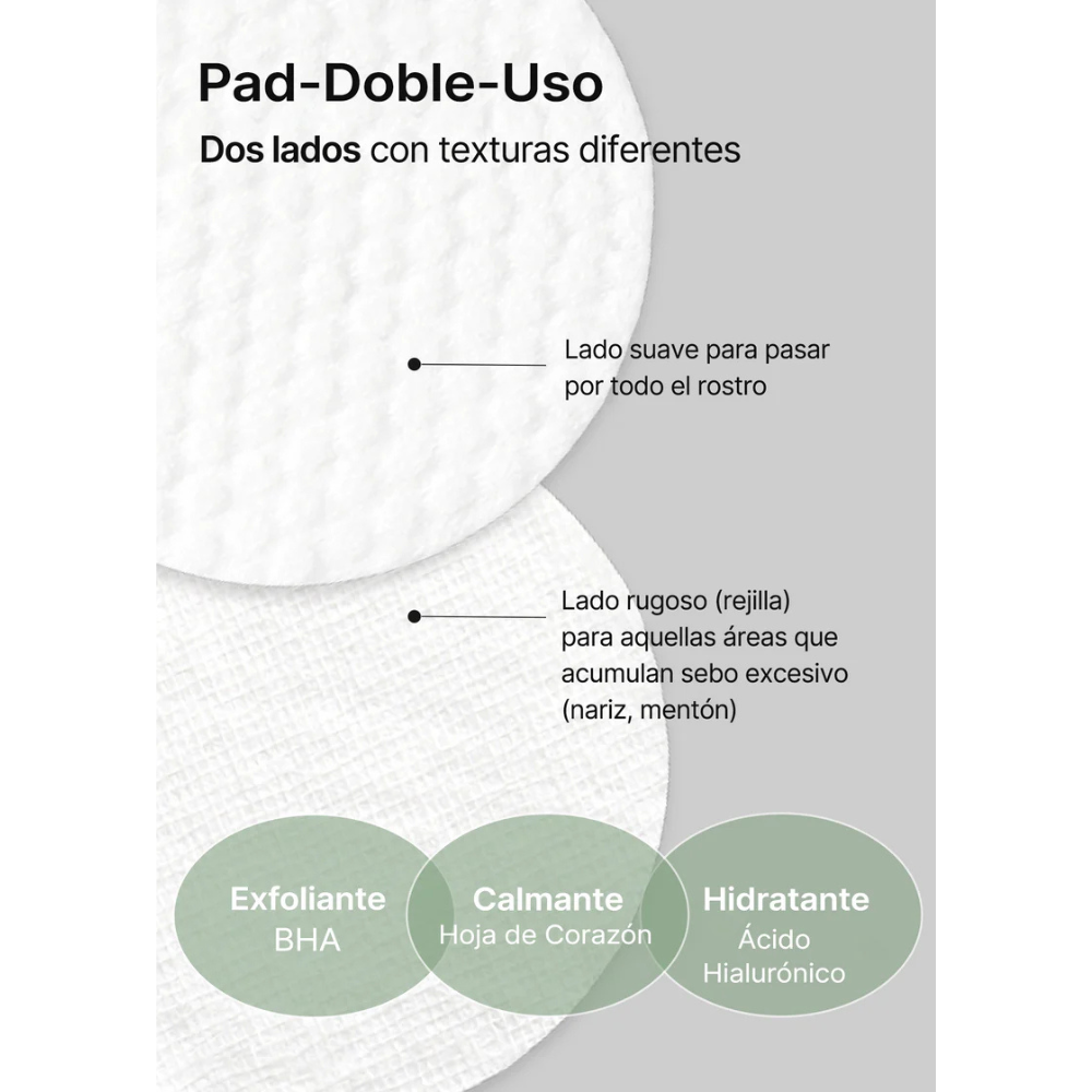 Una almohadilla única de doble cara (algodón y gasa con relieve) que ofrece diferentes propiedades en cada lado: el suave lado con relieve ayuda a exfoliar e hidratar, mientras que el lado de gasa exfoliante maximiza la exfoliación física en zonas como la nariz y la barbilla.
