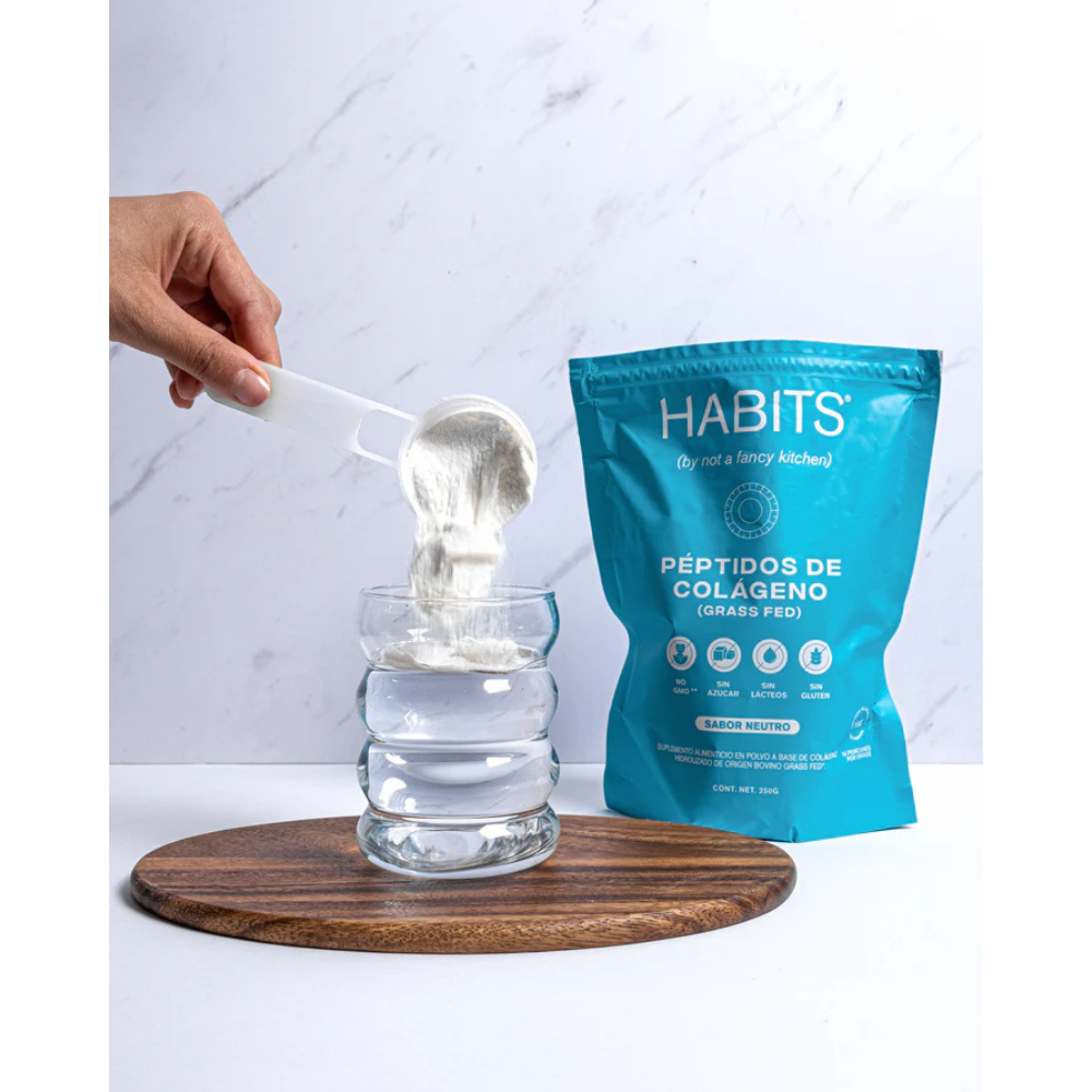Nuestro Colágeno Habits, hecho de un único ingrediente, tiene un sabor neutro y es excelente para agregar al agua, café, batidos, recetas y más.