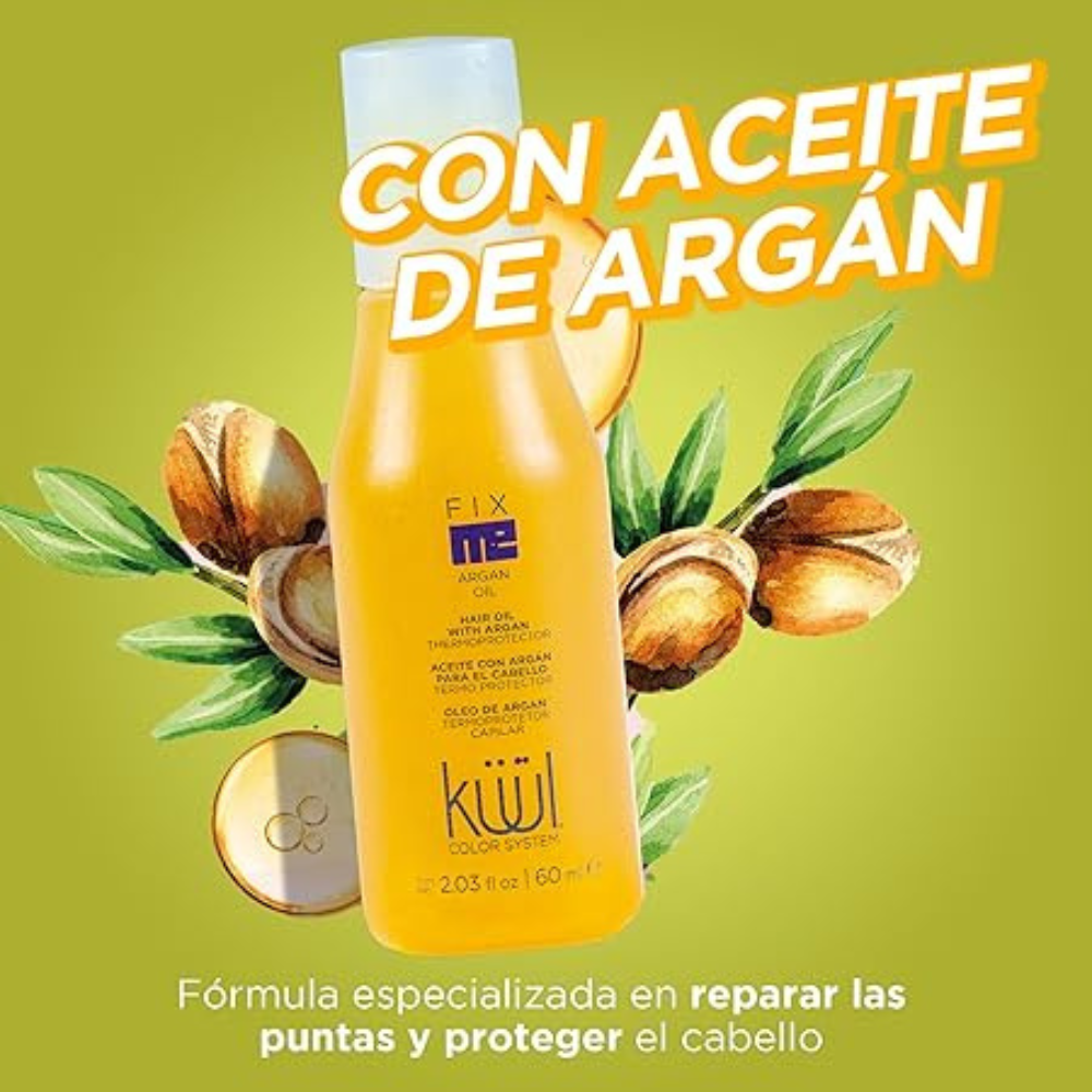 La fórmula de KÜÜL FIX ME ARGAN OIL contribuye a sellar puntas abiertas, resecas y quebradizas, además de ayudar a proteger su cabello contra los daños causados por la contaminación y rayos UV. KÜÜL FIX ME ARGAN OIL contiene aceite de argán e ingredientes que ayudan a proteger el cabello del calor, genera brillo y acondiciona.