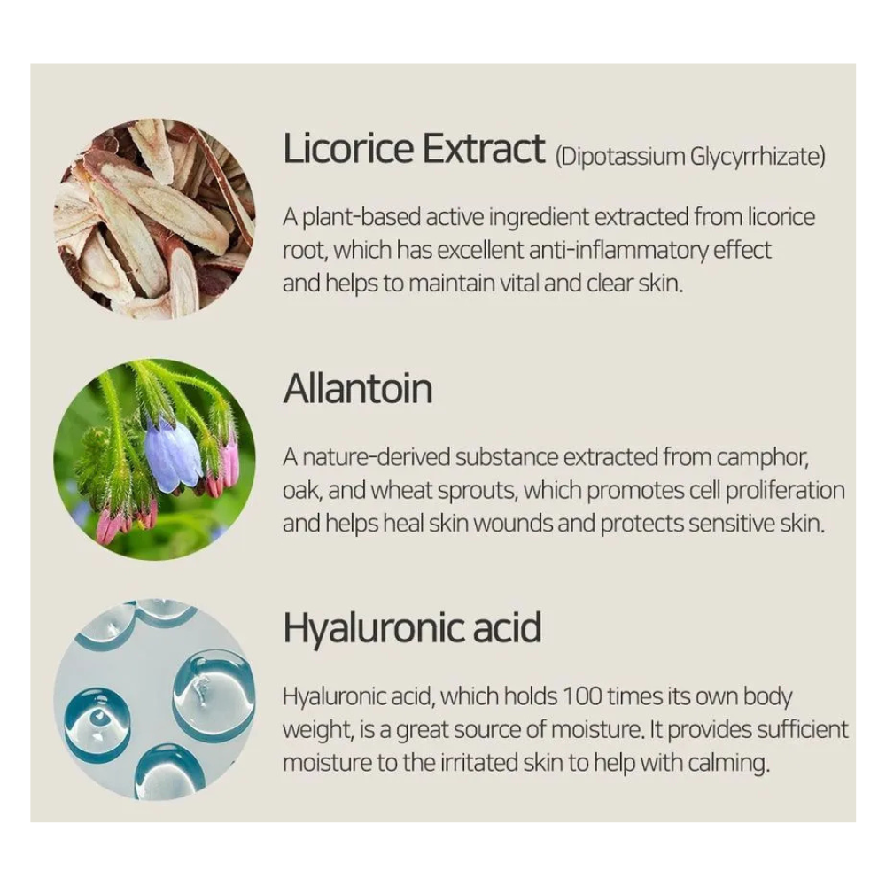 – Contiene extracto de regaliz, alantoína y ácido hialurónico, ingredientes calmantes que actúan sinérgicamente con los extractos de cica, Houttuynia cordata y árbol de té para proteger la piel sensible y proporcionar hidratación, proporcionando un efecto calmante rápido.