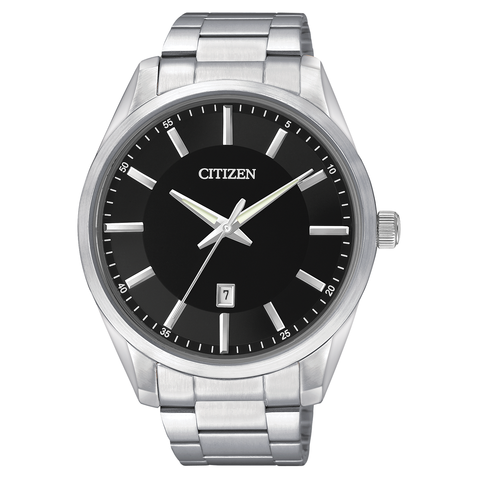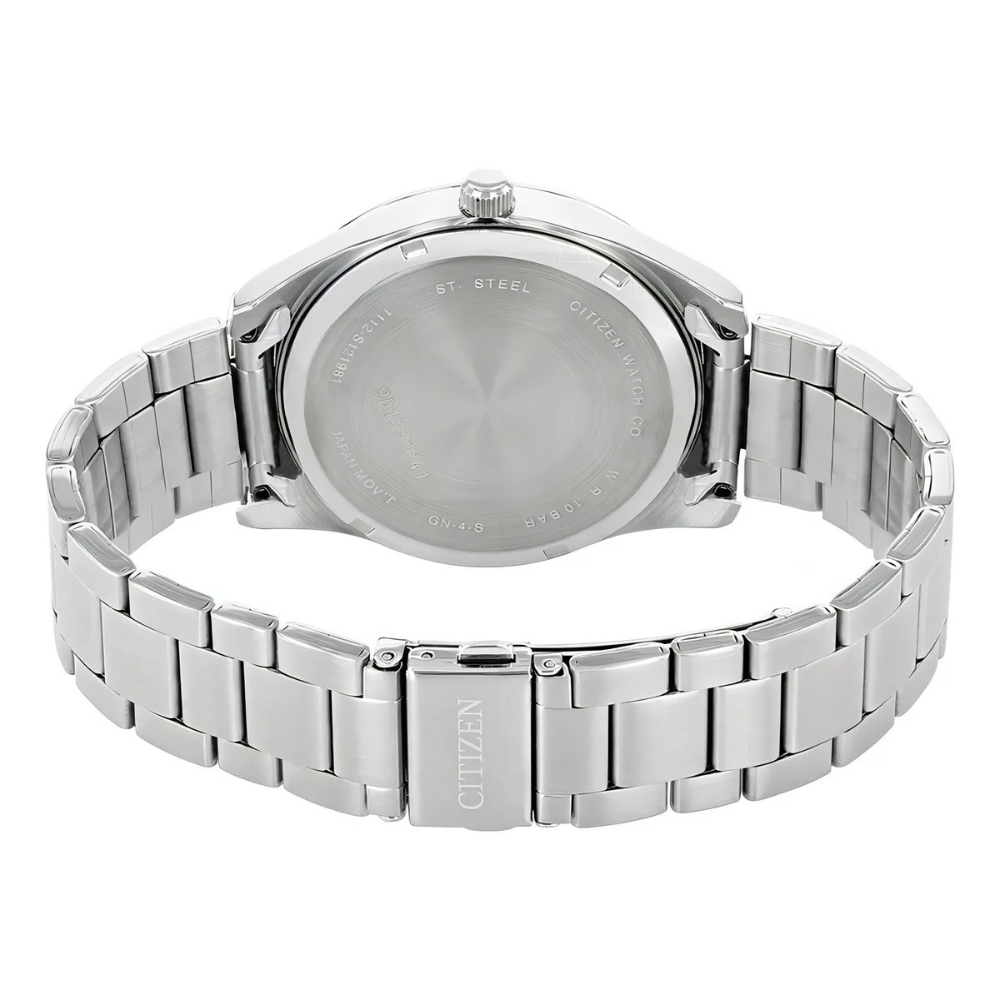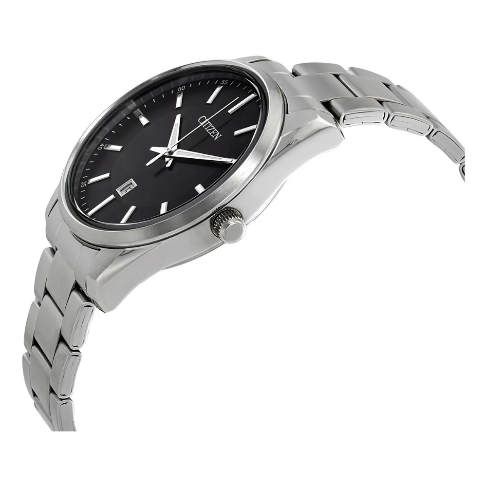 Reloj de cuarzo para caballero. La carátula negra contrasta con la caja y brazalete de acero inoxidable. Requiere batería. Calibre 1112.