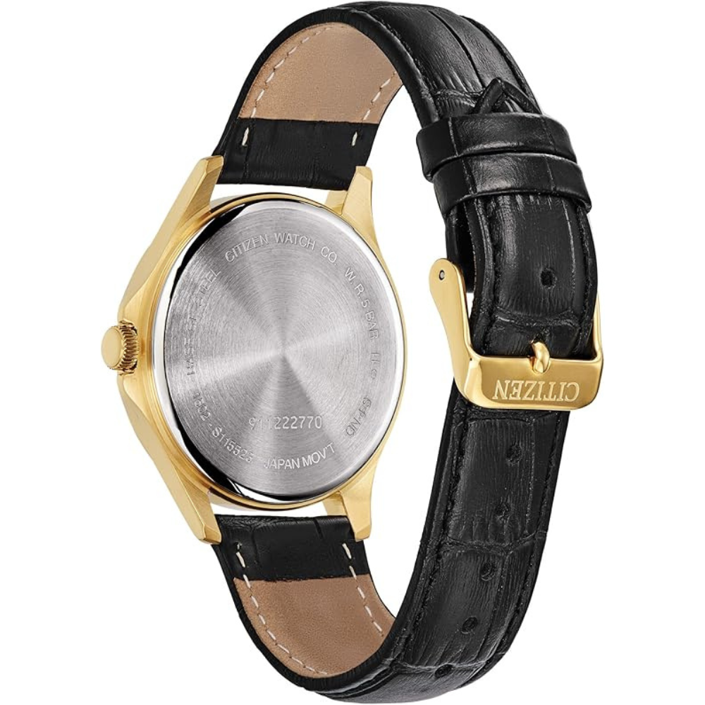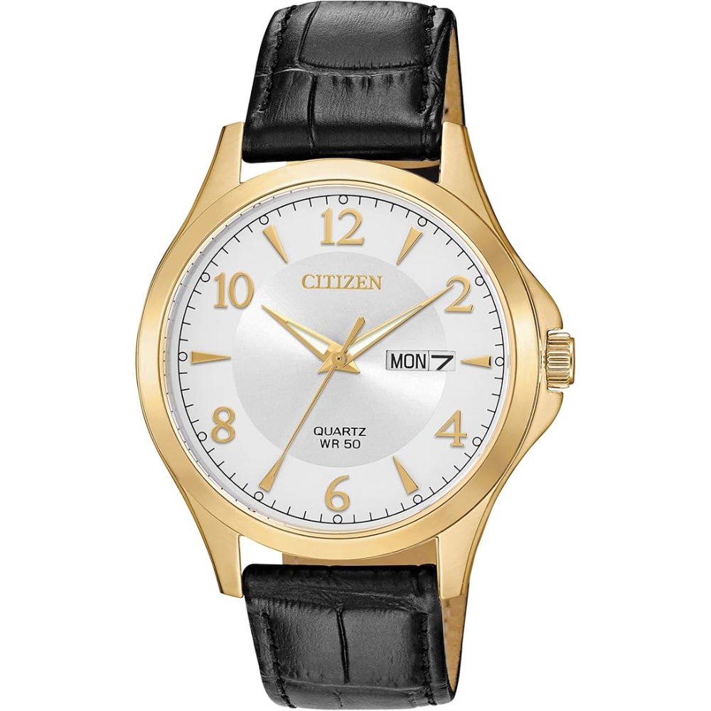 Reloj Citizen de cuarzo para hombre, acero inoxidable con correa de piel negro, caja dorada